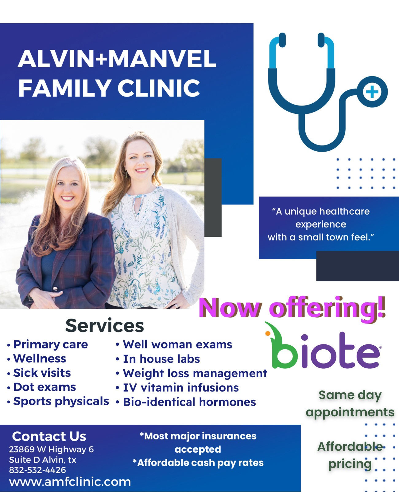 Local, affordable, quality family health care conventiently located between Alvin & Manvel on Highway 6